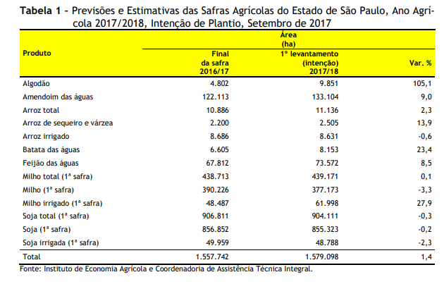 Previsões e Estimativas das Safras Agrícolas do Estado de São Paulo, Intenção de Plantio do Ano Agrícola 2017/18 e Levantamento Final Ano Agrícola 2016/17, Setembro de 2017