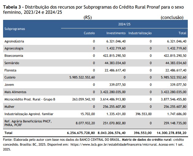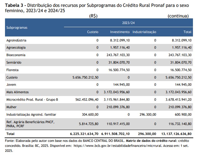 safra 2024/25, essa linha totalizou R$3,6 bilhões para o público feminino e
