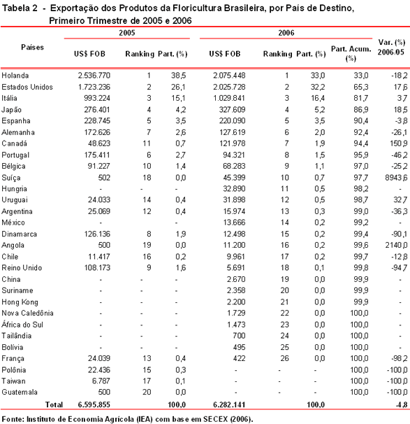 A análise do comportamento do comércio exterior de produtos da floricultura brasileira no período em questão mostrou que os dois principais parceiros comerciais - a Holanda e os Estados Unidos - estreitaram as diferenças em termos de valor comercializado, devido à queda significativa no valor da exportação (18,2%) no primeiro caso e ao aumento de 17,6% no segundo. Um fato positivo é o aumento de 11,2% no valor exportado do produto – o grupo de mudas – que sempre foi o carro-chefe do setor, além do crescimento de 69,1% no grupo de folhagens, produto que apresentava historicamente menor desempenho.3